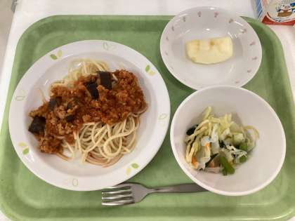 献立 なす入りミートソーススパゲッティ、パリパリポテトのサラダ、りんご、牛乳