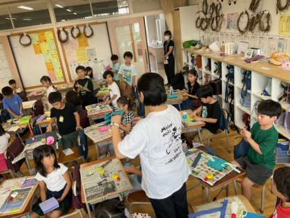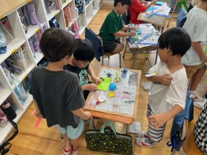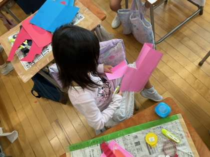図工の時間です。「ぱくぱくさん」たくさん飾りをつけて、お気に入りの作品になりそうですね。