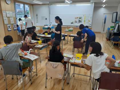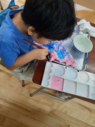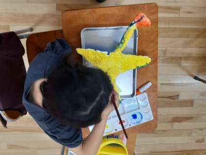 図工の時間です。私にしか作れないすてきな鳥ができあがってます。色とりどりの鳥が今にも飛びそうです。