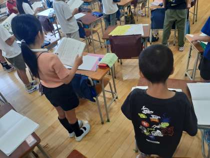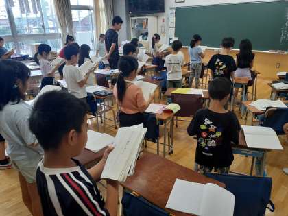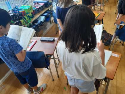 国語の時間です。元気よく音読する声にひかれて、教室に入りました。みんな上手に読むことができました。