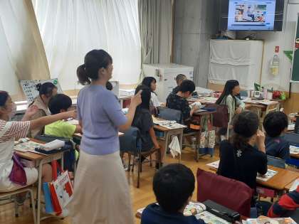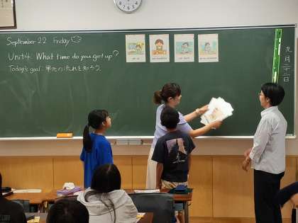 外国語の時間です。ジェスチャーゲームをやりながら、1日のスケジュールを伝える言葉を練習しました。