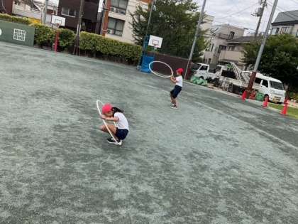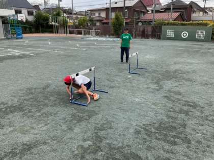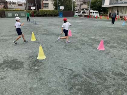 体育の時間です。障がい物を跳び越えたり、くぐったり、いろいろな動きに取り組んでいます。