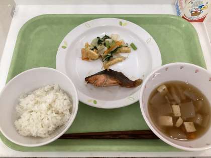 献立 ご飯、鮭の焼きづけ、カリカリ油揚げのサラダ、のっぺい汁、牛乳