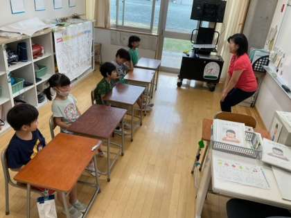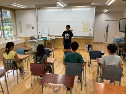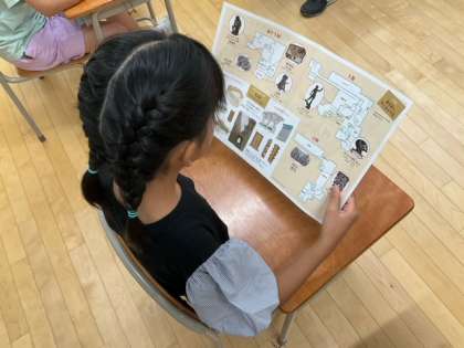 明日の予定を確認しています。4年生は美術鑑賞教室、5年生は社会科見学です。