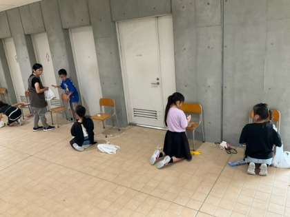 図工の時間です。「のこぎりひいて ザクザクザク」木材を切って、作品づくりに使うピースを作っています。