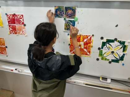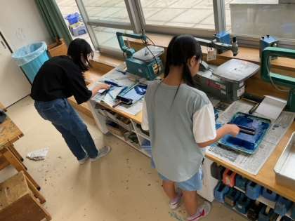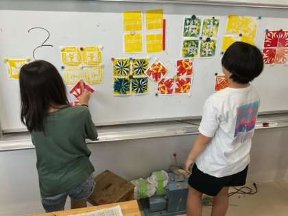 図工の時間です。「彫りすすみ版画」続々と作品が完成しています。色の重なり具合がすてきです。