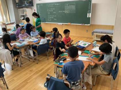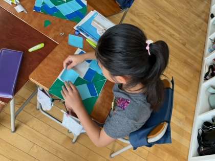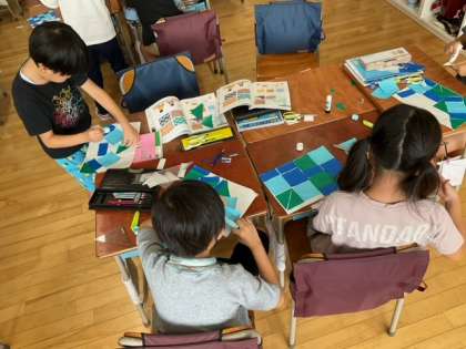 算数の時間です。「きれいなもようを作ろう!」三角形と四角形の色紙を自由に貼り合わせて、きれいなもようを作っています。
