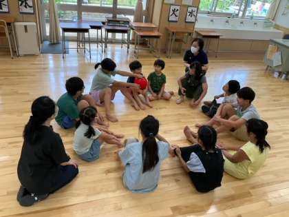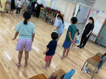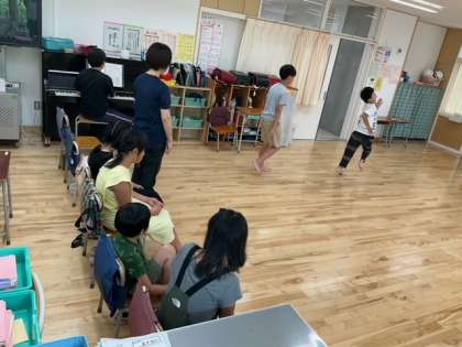 生活単元の時間です。ピアノの音に合わせて、いろいろな動きに挑戦しています。音をよく聞いてくださいね。