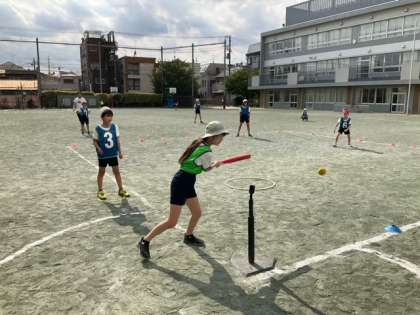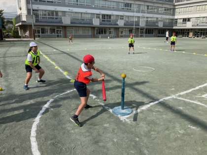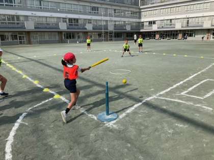 体育の時間です。Tボールの試合が白熱しています。守備がよくなってきました。