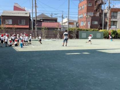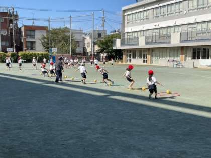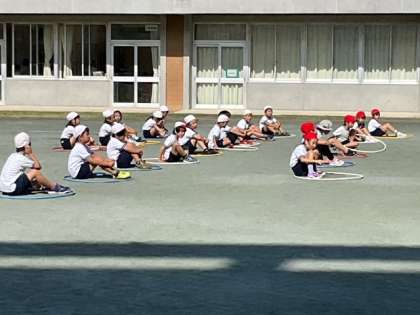 体育の時間です。さわやかな青空の下で、元気に体を動かしています。