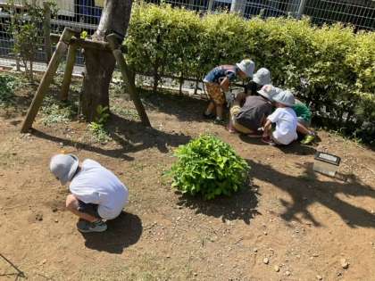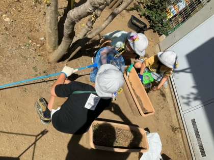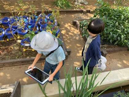 生活科の時間です。「いきものをさがそう」下北沢小学校には、どんな生き物がいるのでしょうか? 「あっ、ダンゴムシ!」