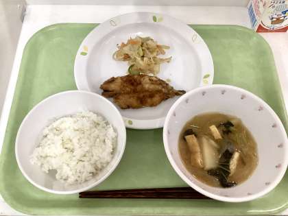 献立 ご飯、いわしの南蛮漬け、こんにゃくサラダ、じゃが芋と玉ねぎのみそ汁、牛乳