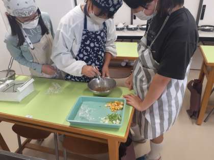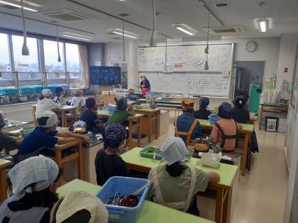 家庭科の時間です。だしをしっかりとって、おいしいお味噌汁を作っています。班でしっかり協力しています。
