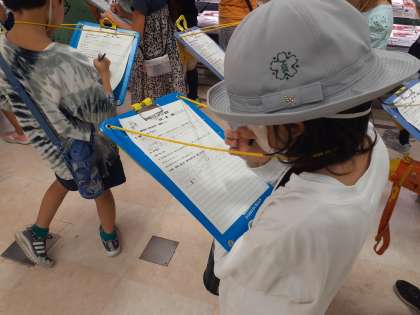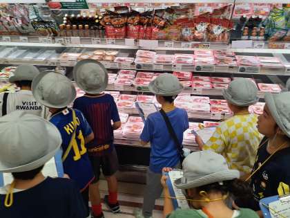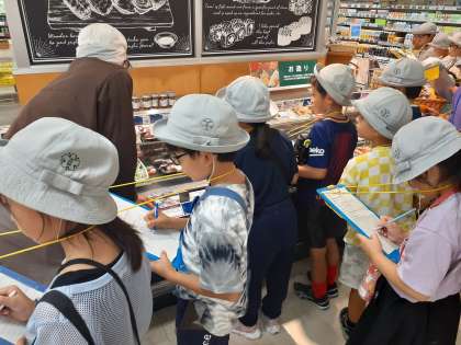 ピーコックストア下北沢店に店内のくふうや働く人たちの様子を調べにきました。お店の人の話を真剣に聞いてメモしていました。