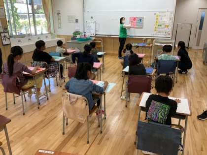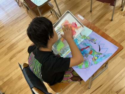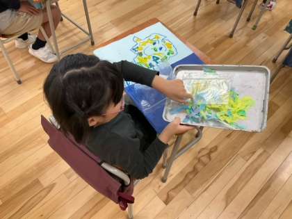 図工の時間です。「きたかぜとたいよう」色紙を貼って、立体的に仕上げていきます。