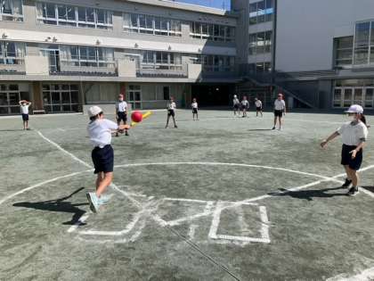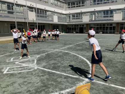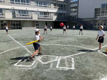 体育の時間です。「ベースボール」に取り組んでいます。投げられたボールを打つのはなかなか難しいですが、練習あるのみです。