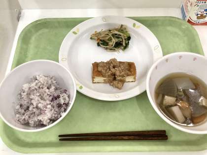 献立 ゆかりご飯、生揚げの肉みそかけ、小松菜のおかか和え、けんちん汁、牛乳