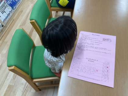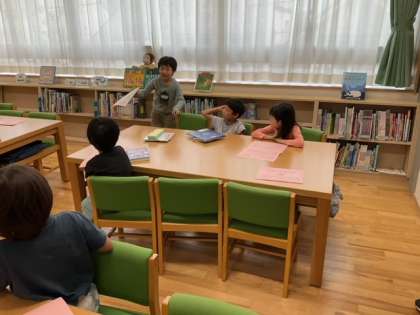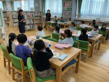 読書の時間です。司書の先生から、新しい本の紹介や読書カードの説明がありました。