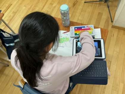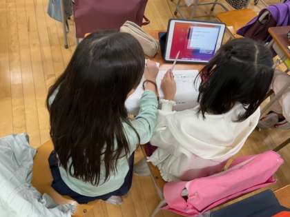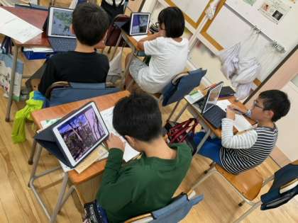 理科の時間です。季節によって、木々はどう変わっていくのかを観察しています。季節の移り変わりを感じますね。