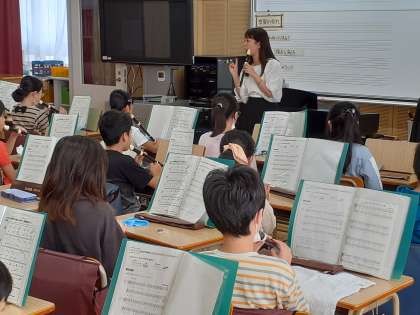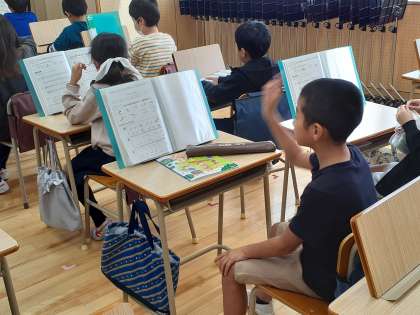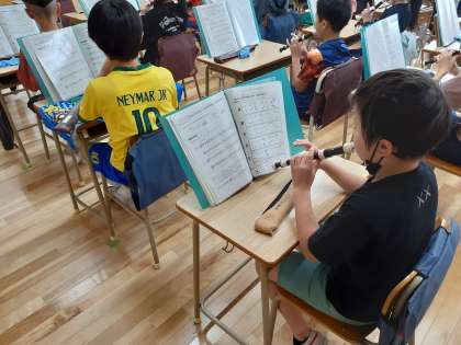 音楽の時間です。レガートやスタッカートを意識してリコーダーを吹きました。体を揺らしていて、音楽を楽しんでいます。