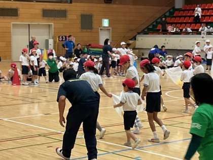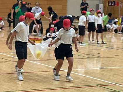 児童全員が4チームに分かれて「宝運び」を行いました。くるみ学級のチームは、見事1位になりました。