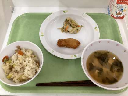 献立 秋の香りご飯、いかの竜田揚げ、野菜のごま和え、豆腐とわかめのみそ汁、牛乳
