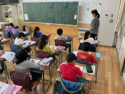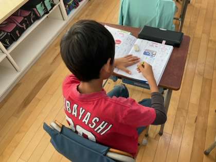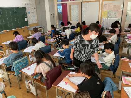 「2−2」国語の時間です。漢字の練習を進めています。姿勢よく、筆圧も強く書くことができています。