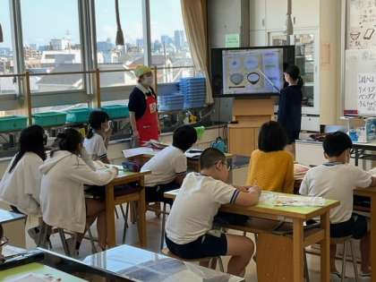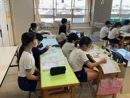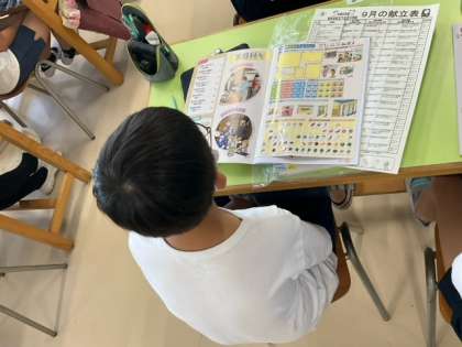 家庭科の時間です。ご飯を主食に、一食分の献立を考えています。良いバランスの献立を工夫することができましたね。
