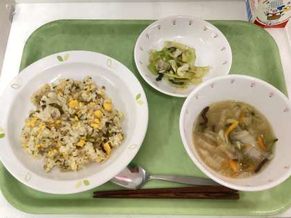 献立 高菜チャーハン、大豆入りゆで野菜、白菜のとろとろ中華スープ、牛乳