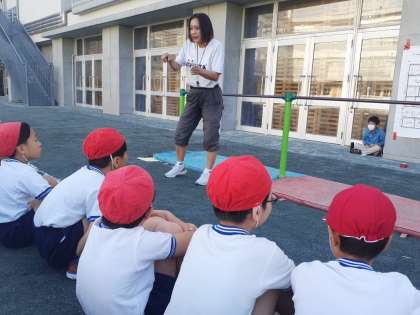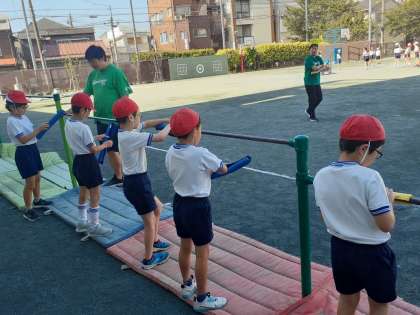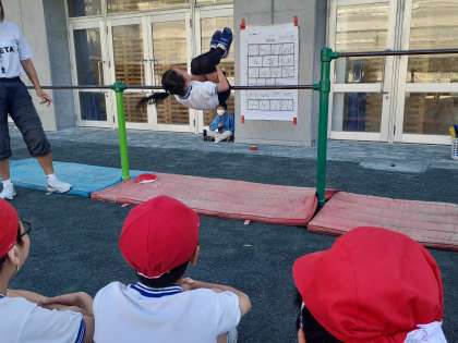 「3ー1」体育の時間です。だるま回りや逆上がりにチャレンジしました。