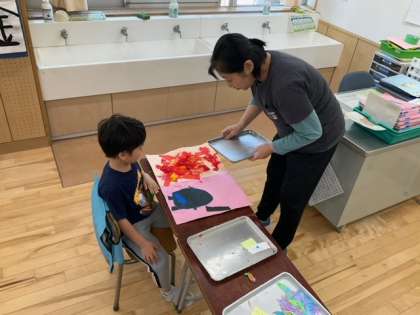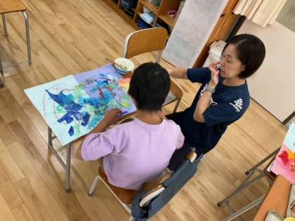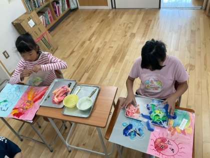 ?図工の時間です。「きたかぜとたいよう」完成が近づいてきました。色紙の感じが、とてもすてきです。