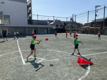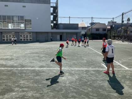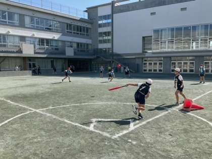 体育の時間です。「ベースボール」の試合風景です。審判もがんばっています。