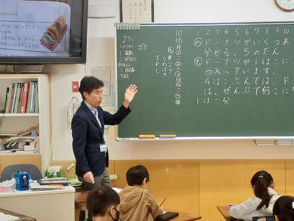 算数の時間です。五のだんを使って文章題を解きました。なぜその式になるのか理由もよく考えていました。