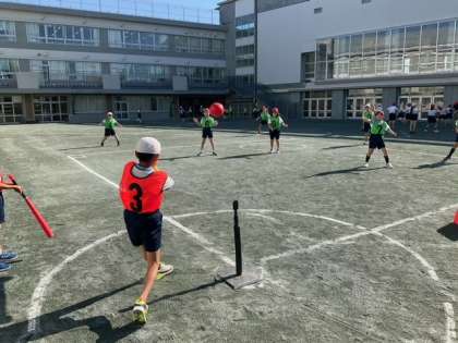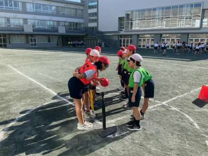体育の時間です。礼儀正しくあいさつをして,Tボールのゲームが始まりました。