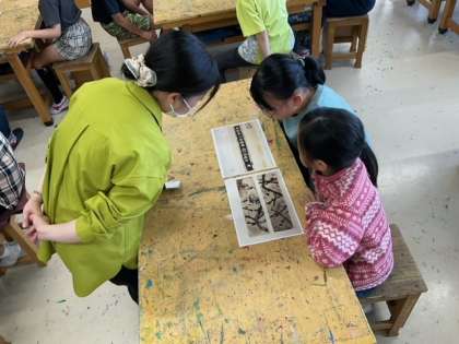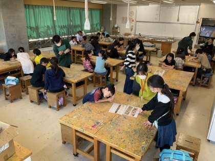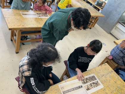 図工の時間です。世田谷美術館による「美術監督プログラム」を行っています。白と黒で味わい深い作品を作っていきます。
