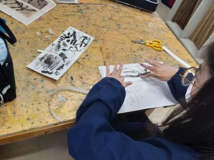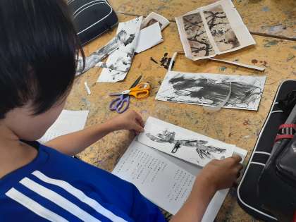 美術鑑賞プログラムの時間です。一人一人の作品を校歌の歌詞が書いてある台紙に貼りました。すてきな作品がたくさんできました。