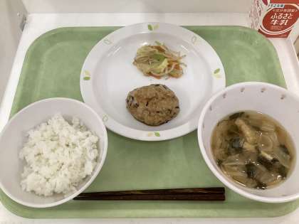 献立 ご飯、豆腐とひじきのハンバーグ、キャベツのピリ辛和え、白菜のみそ汁、牛乳