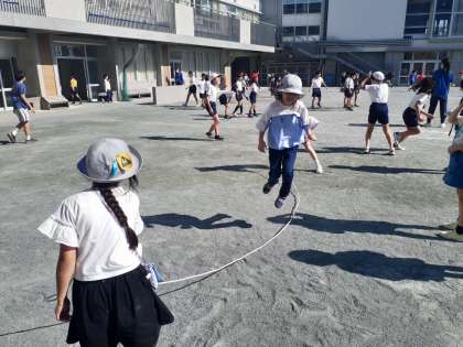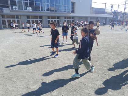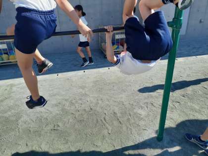 今日もとてもよい天気です。鬼ごっこやドッジボール、鉄棒、長縄など元気に遊んでいます。