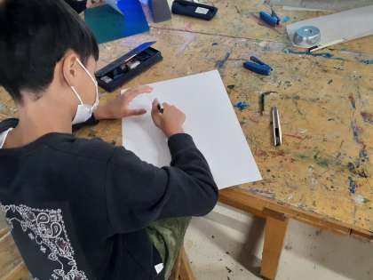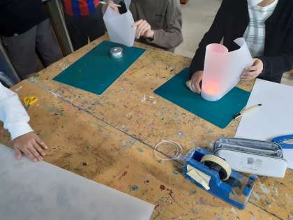 図工の時間です。カッターで紙を折ったり、切ったりして明かりがすてきに見えるように作っています。