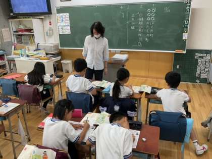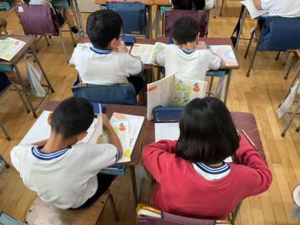 国語の時間です。絵の中の町に住んでいるつもりで、町の様子を説明する文章を書いています。