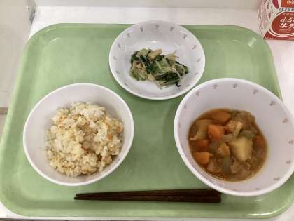 献立 にんじんご飯、韓国風肉じゃが、サクサク高野豆腐のサラダ、牛乳
