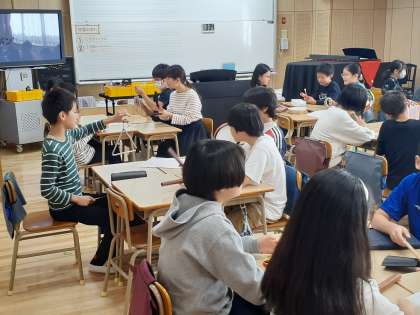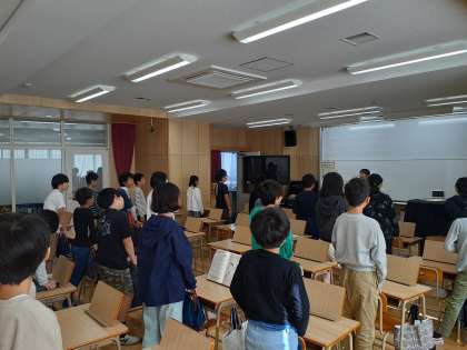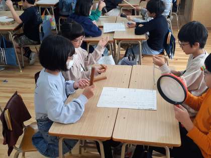 音楽の時間です。打楽器を使ってグループで工夫して、リズムアンサンブルを作りました。演奏の仕方も工夫してレベルアップしています。