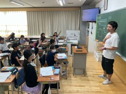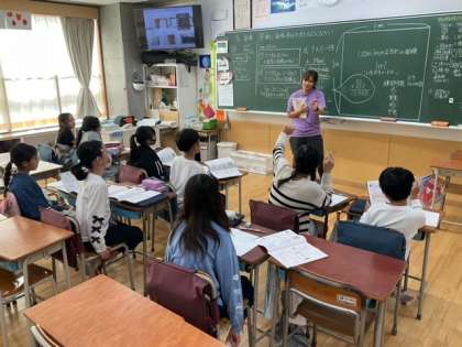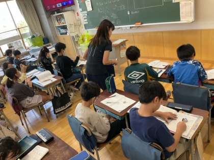 算数の時間です。長方形や正方形の面積を求め方を考えています。既習事項をうまく活用しています。