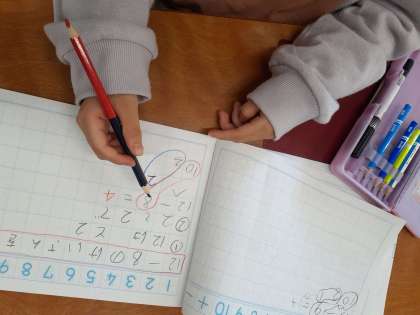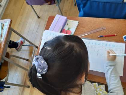 算数の時間です。10のまとまりを考えて、引き算を練習しました。よくかんがえていることがノートからよく分かります。