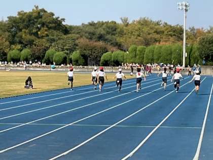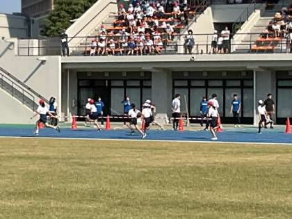 競技が始まりました。大声援の中、力いっぱいに走っています。「あ〜、緊張した」