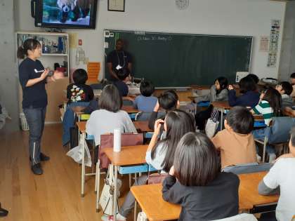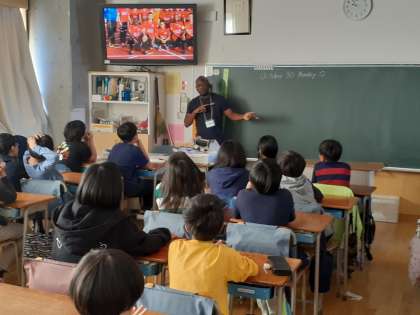 外国語の時間です。クリス先生からの自己紹介を興味深そうに聞いていました。イギリスの給食メニューに驚いていました。