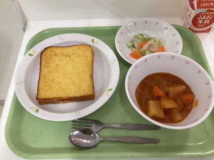 献立 オレンジフレンチトースト、チキントマトシチュー、キャベツサラダ、牛乳