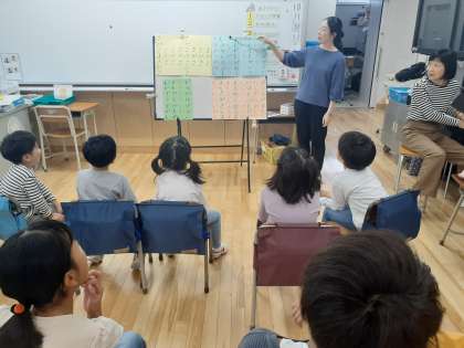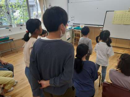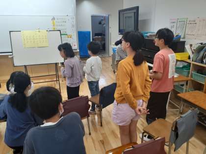 音楽の時間です。さかさまになる言葉をたくさん使って歌いました。とても楽しそうです。