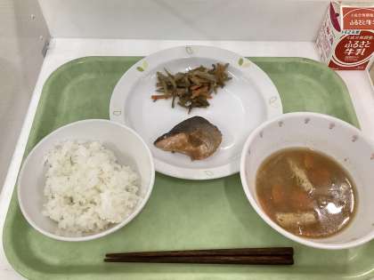 献立 ご飯、鮭のねぎ塩ソース、茎わかめのきんぴら、さつま汁、牛乳