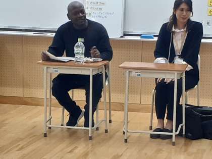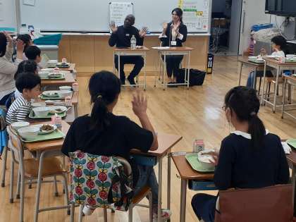 給食の時間です。クリス先生を招いて、給食を食べました。英語で献立を紹介してもらったり、料理の話をしたりしました。